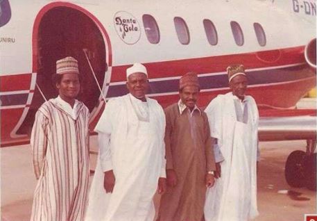 Chairman of Dangote Group Alhaji Aliko Dangote (first left), Dangote's grandfather who gave him seed capital to start to his business, Late Alhaji Sanusi Dantata (Second left), Alhaji Hassan Dantata (second right) and late Qadiriyyah scholar Sheikh Alin Kumasi (first right) in the early 80's. (Trezzy Helm)