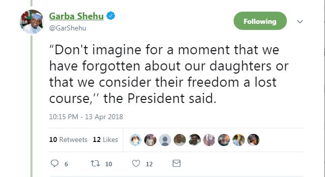“Don’t imagine for a moment that we have forgotten about our daughters or that we consider their freedom a lost course,” he quoted the President, who is in London, as saying.