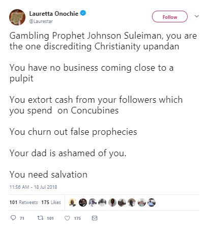 Onochie tweeted, “Gambling Prophet Johnson Suleiman, you are the one discrediting Christianity upandan.