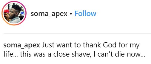 A former Big Brother Naija housemate, Soma, has escaped tragic death after getting involved in a near fatal accident.