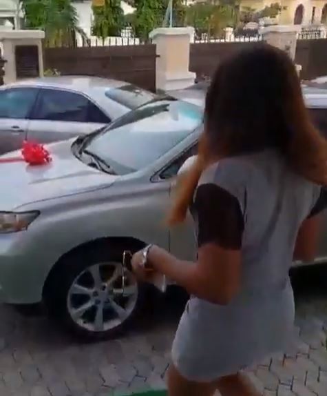 The Lexus SUV was delivered early this morning and she couldn’t contain her excitement after the car was presented to her with a big red bow and flowers.