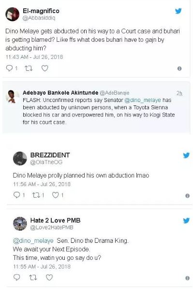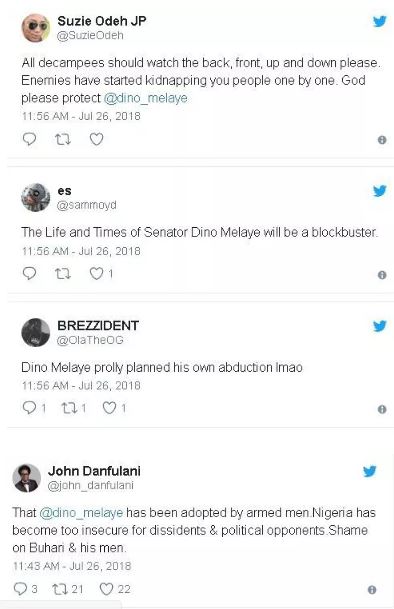 Following reports that Senator Dino Melaye was earlier today allegedly abducted by unknown gunmen, Nigerians have taken to social media to react.