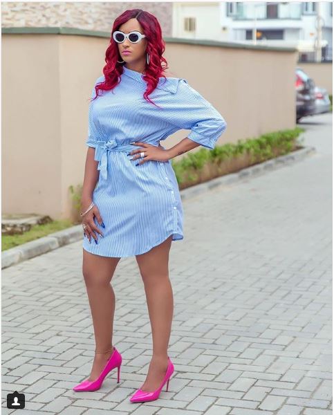 In one of her pictures, she matched the colour of her hair with that of her shoes. She has also been pictured rocking other hair colours like brown and pink in previous photos. Anyway, some social media users believe it looks good on her.