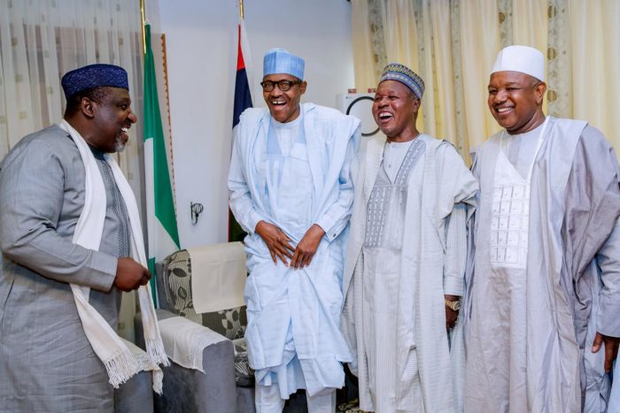 Imo state Governor Rochas Okorocha and chairman of APC governors’ forum threw some ‘wicked’ joke that got President Muhammadu Buhari and Governor Aminu Masari, and Governor Atiku Bagudu, laughing excitedly on Thursday in a photo shared by News Agency of Nigeria.