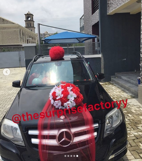 On how she received her gift, they shared another post with the caption: “She put a call through to her husband immediately after the foyer surprise! She had no idea the Benz was outside. We beckoned on her to step out briefly & this happened!”